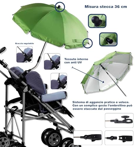 Ombrellino parasole universale adatto a tutti i tipi di trio. Sistema di aggancio pratico e veloce ed adattabile a ovetto,carrozzina e passeggino. Si adatta anche a bici, seggiole e tricicli.