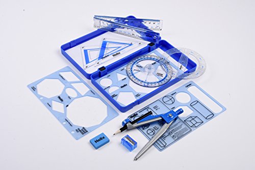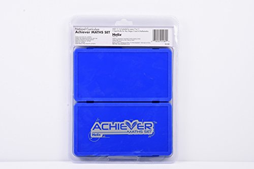 Il set Helix Maths Achiever contiene un righello pieghevole brevettato da 30 cm, misura angolare, modello per torta grafica, temperamatite con viti anti-manomissione, gomma, 2 modelli di forma, bussola autocentrante con matita da 9 cm e punto di sicurezza, il tutto presentato in una custodia blu.