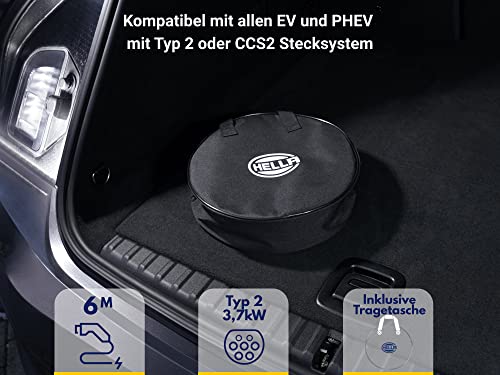 HELLA 8KE 358 255-031 - Cavo di ricarica per auto elettriche EV e Plug-in Hybrid - 16 A - fasi: 1 - 3,7 kW - Lunghezza cavo di ricarica: 6 m - spina di ricarica tipo 2 - nero