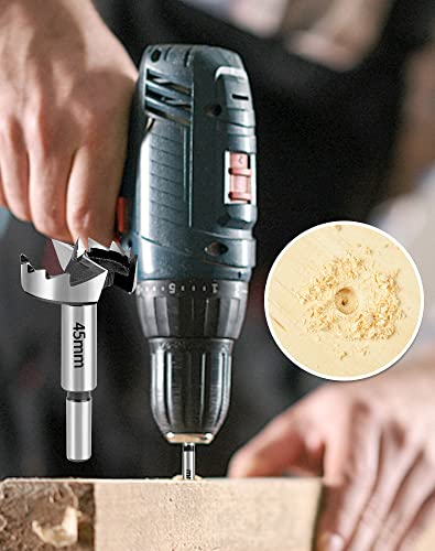 Punta professionale Forstner: diametro di foratura: Ø 45 mm, dimensione gambo: 10 mm, profondità di foratura: 60 mm, lunghezza totale: 90 mm. Punta per legno di alta qualità con codolo cilindrico, adatta per tutti i trapani e trapani. Facile rimozione dei trucioli: l'ampio foro di rimozione dei trucioli può essere rimosso più facilmente durante la foratura per tagliare i fori puliti e lisci più velocemente.
