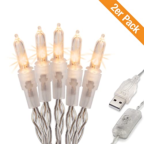 Hellum Pisello 150698 - Set di 2 luci a LED per interni, con interruttore, luce bianca calda, con connettore USB, cavo trasparente illuminato 408 cm, catena luminosa