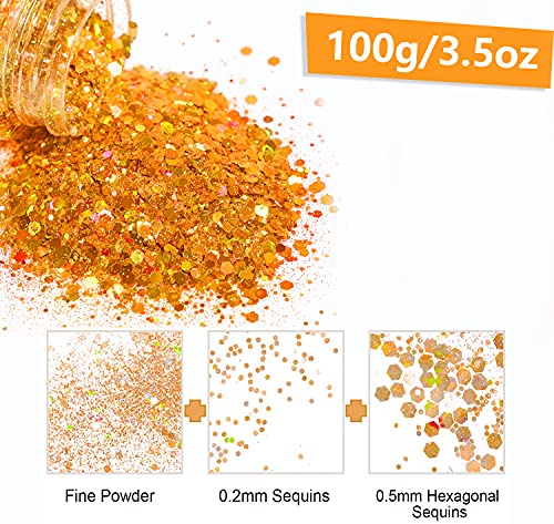 HEMOER Paillettes Olografiche Glitter Grosso, Royal Gold 100g Olografiche Chunky Paillettes Glitter Unghie per Viso, Corpo, Occhi, Capelli, Unghie, Glitter per Hobby Creativi