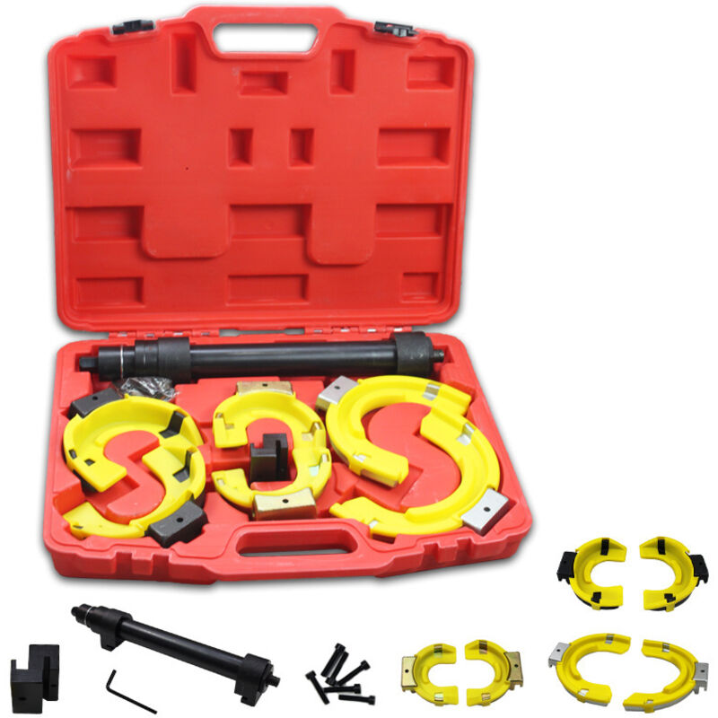 Strumento multi-applicazione Questi compressori a molla sono progettati da moderne sospensioni macpherson. con una gamma di 3 set di forcelle monoblocco. adatto a: ✔️Chrysler. Daihatsu. Daewoo. Fiat. Ford. Honda. Hyundai. Jaguar. Jeep. Kia. Mazda. Benz Classe C ed E. Mitsubishi. Nissan. Opel. Renault. Mini. Porsche. Land Rover. Saab. Subaru. Toyota. Volvo . VW ✔️Adatta a Mercedes Benz: W163. 164. 171. 210. 211. 219. 230. 245. 251. 203 e 209 (solo 4-matic). ✔️Si adatta a BMW: E31. E32. E34. E36. E38. E39. E52. E60. E61. E63. E64. E65. E66. E67. Z3. Z3 Coupé Unità telescopica con cinghia di fissaggio mobile 3 teste di serraggio con piastre di bloccaggio a molla: 80 mm - 115 mm 110 mm - 150 mm 140 mm - 195 mm Adattatore di prolunga per molla non cilindrica Le coperture proteggono le molle verniciate da eventuali danni !!! Carico massimo 1050 kg / 10200 Nm e non deve essere superato !!!! Distanza massima tra le mensole 12.550 ". Non è progettato per l'uso con avvitatori a impulsi.