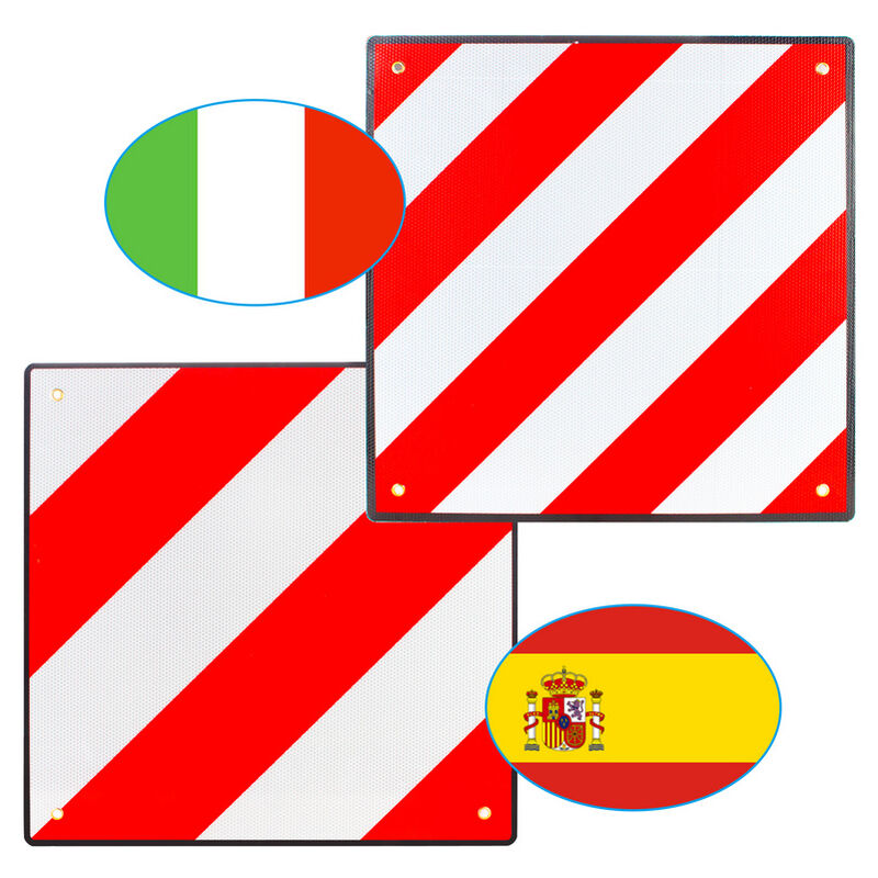 Il segnale di avvertimento riflettente di 50 x 50 cm viene utilizzato per segnalare i carichi sporgenti su veicoli da campeggio. portabiciclette. rimorchi. roulotte. rimorchi per barche. portabiciclette per auto e altre attrezzature estensibili. Sia in Spagna che in Italia. il segnale di pericolo per i carichi sporgenti o sporgenti posteriormente è obbligatorio e deve essere ben visibile. Con gli occhielli di montaggio si garantisce che il vento non possa attorcigliare nulla. Cartello di avvertimento in alluminio. Spagna E Italia 2in1 Spagna: 3 strisce catarifrangenti rosse / 3 bianche tratteggiate Italia: 5 strisce riflettenti a tratteggio rosso / 4 strisce riflettenti a tratteggio bianco Materiale: alluminio. alta qualità e durata Dimensioni: 50 x 50 cm Riflettente fino a 300 m Pannello reversibile (1 lato Spagna / 1 lato Italia) 4 occhielli rinforzati per un facile fissaggio Contenuto della fornitura: 1x cartello di avvertimento Questo cartello di avvertimento è per ENTRAMBI i