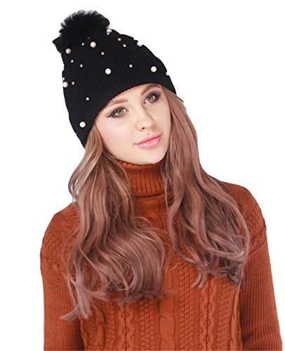 Hengsong Donna Perline Berretti Cappello Autunno Inverno per Le Donne a Mano a Maglia Cappello Caldo Elastico Caps (Nero)