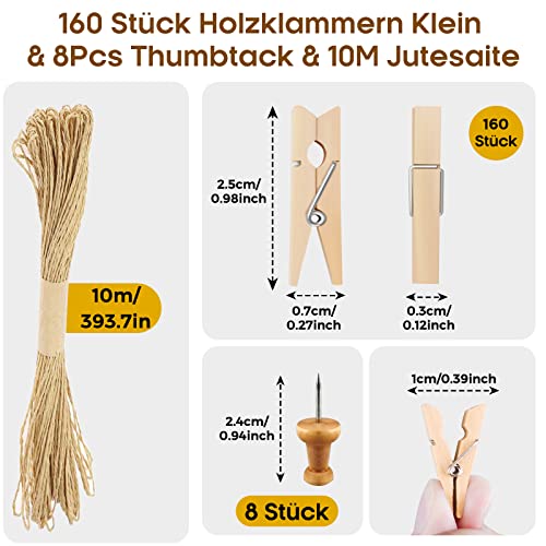 168PCS Mini pioli di legno: Il pacchetto include un totale di 160PCS mini pioli di colore legno, una corda di filo di iuta lunga 10 metri e 8PCS piccole miniature di legno