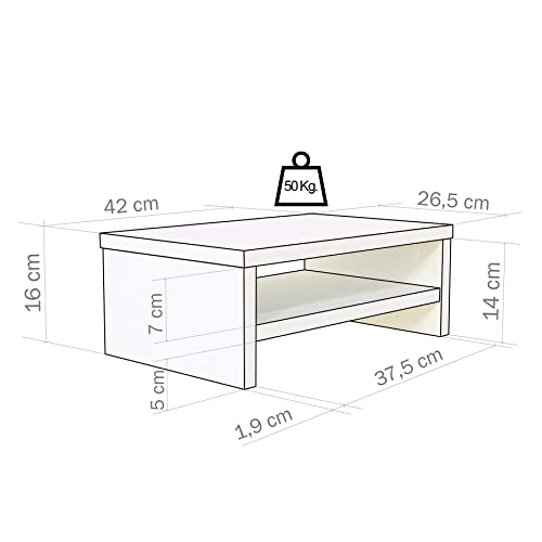 Base di appoggio per sollevare TV o monitor con ripiano intermedio, realizzata in melaminico ad alta resistenza da 19 mm. Foro interno libero 37,5 cm (larghezza) x 26,5 cm (profondità) x L'altezza libera dello spazio interno superiore è di 7 cm e quello inferiore è di 5 cm. Capacità di carico 50 Kg.