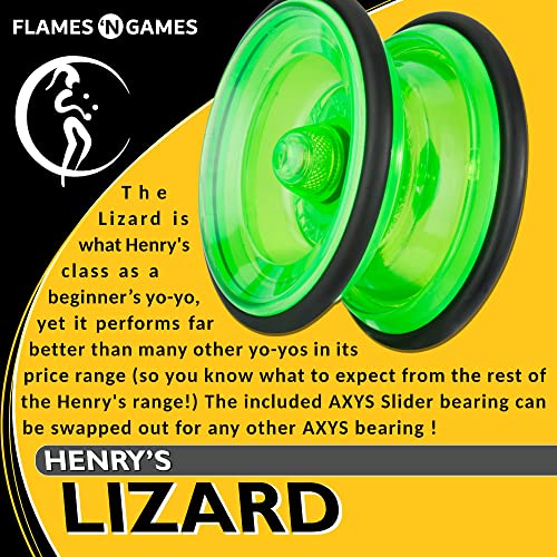 Gli stessi Henrys classificano la lucertola come uno yo-yo per i principianti, eppure superano molti altri yoyo nella sua fascia di prezzo. Dopo questa affermazione, sai cosa aspettarti per il resto della gamma Yo-Yo di Henry! La lucertola ha un cuscinetto AXYS "Slider", che può essere successivamente aggiornato con uno qualsiasi degli altri cuscinetti AXYS. Questo grande intro yoyo ha lunghi tempi di sonno con una grande forma (farfalla) che consente di eseguire trucchi di grande portata. Largh