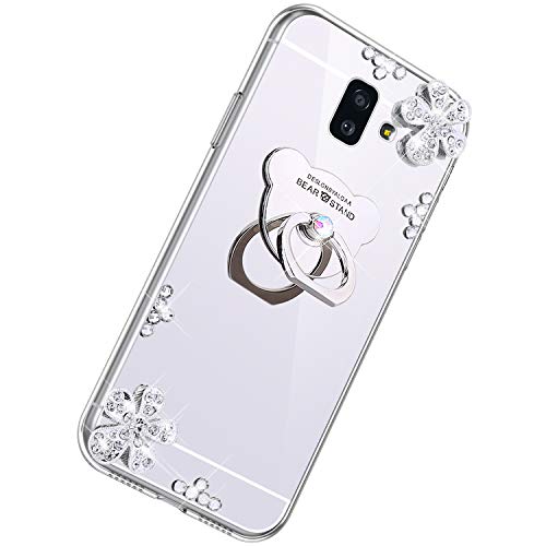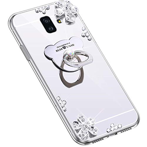 Herbests Compatibile con Samsung Galaxy J6 Plus 2018 Custodia Ultra Sottile Silicone Protettiva Case Cover Specchio con Anello Bear Ring Supporto e Glitter Diamante a Strass Cover Custodia,Argento