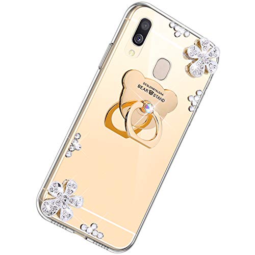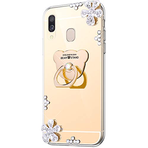 Herbests Compatibile con Samsung Galaxy A40 Custodia Ultra Sottile Silicone Protettiva Case Cover Specchio con Anello Bear Ring Supporto e Glitter Diamante a Strass Cover Custodia,Oro