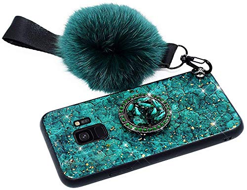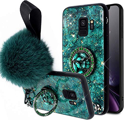 Herbests Compatible per Samsung Galaxy S9 Custodia Ultrasottile Silicone Cover con Anello Sparkle Glitter Bling a Strass + Hairball Case Cover Antiurto Anti Scratch Custodia,Verde
