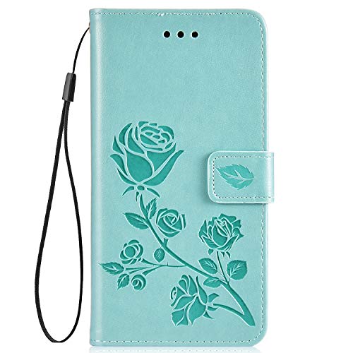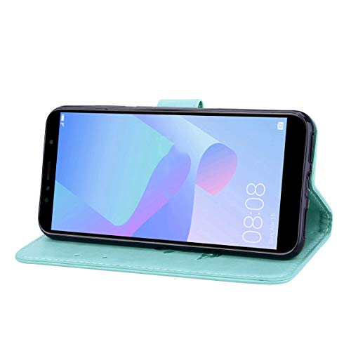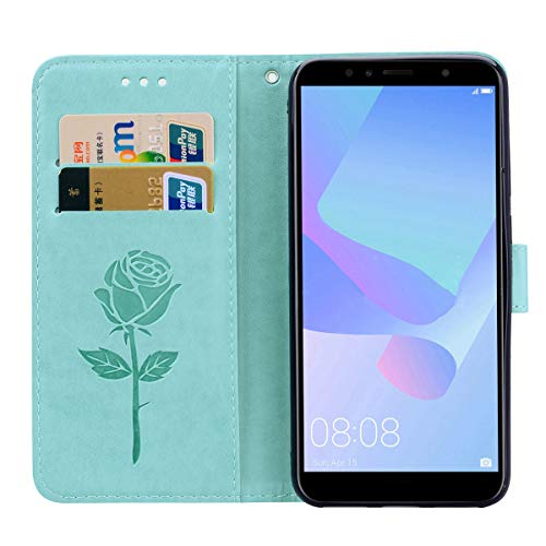 Herbests Cover compatibile con Huawei Y6 2018 Custodia PU Leather Retro Vintage Flip Cover Case Goffratura Rose Fiore Modello Copertura Puro Color Custodia Portafoglio, Verde