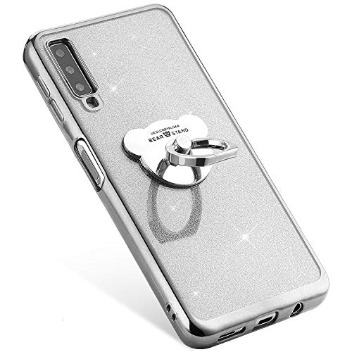Herbests Cover Case Compatibile con Samsung Galaxy A7 2018, Custodia Glitter Sparkle Bling TPU Silicone Cover con Orso Anello Ring Supporto Ultra Sottile TPU Gomma Silicone Protettiva Case,Argento
