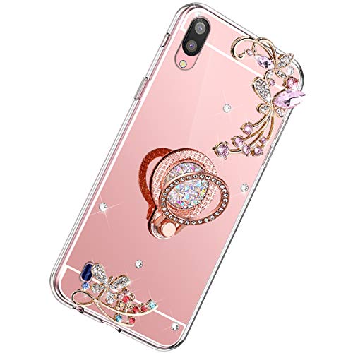 Herbests Cover Case Compatibile con Samsung Galaxy A10 Mirror Custodia Silicone Diamante Glitter Bling Cover con Supporto Anello Custodia Flessibile Gomma Morbida Silicone Case,Oro Rosa