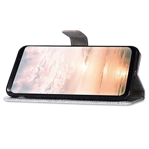 Herbests Cover Compatibile per Samsung Galaxy J6 2018 Flip Case PU Pelle Custodia Portafoglio Sparkle Glitter Bling a Strass Diamante Custodia Caso Fibbia Magnetica Leather Case,Argento