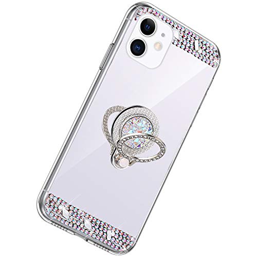 Herbests Cover per iPhone 11 Custodia Silicone Specchio Cover Ultra Slim Sottile Antiurto TPU Silicone Custodia Brillantini Diamond Strass Cover Case con Supporto Anello,Argento