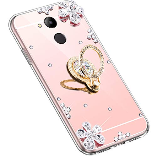 Herbests Cover Specchio per Huawei Honor 6C Pro/Honor V9 Play Sottile Custodia Silicone Glitter Bling Diamante Brillante con Anello Supporto Cover TPU Silicone Protettiva Morbido Case, Oro Rosa