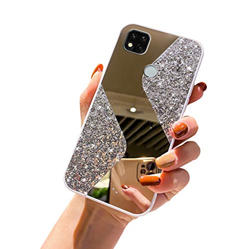 Herbests Custodia Compatibile con Xiaomi Redmi 9C Cover Glitter Bling Brillantini Paillettes + Specchio Back Cover Ultra Sottile Copertura TPU Bumper Antiurto Case Cover,Bianco