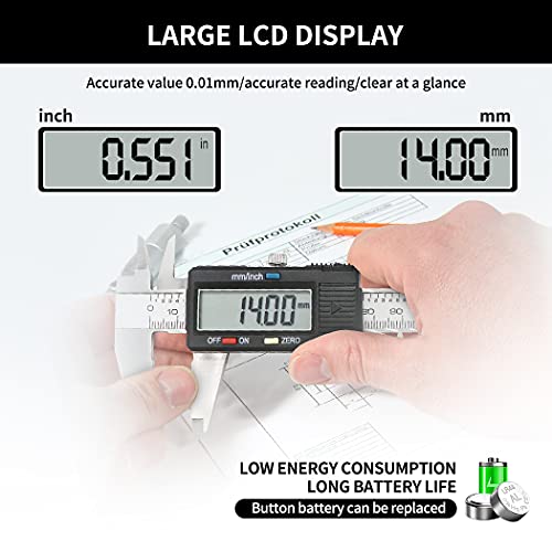 Grande display LCD: calibro digitale con schermo LCD che mostra i dati precisi, chiaro e intuitivo. Batteria al litio da 1,5 V, lunga durata, lo spegnimento automatico consente di risparmiare la batteria dopo 5 minuti, se non viene utilizzata. IP54 Doppia protezione contro polvere, macchie d'acqua e macchie di olio (nota: non utilizzare in acqua)