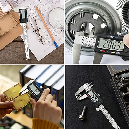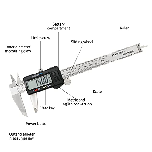 Struttura delicata e di qualità: il calibro digitale è realizzato in acciaio inossidabile di alta qualità, è molto liscio da maneggiare, non arrugginisce e resistente all'usura. La scala graduata sul calibro digitale utilizza la tecnologia di scala laser che è resistente alle alte e basse temperature, alla corrosione, ai bassi coefficienti di attrito, alla bassa tensione superficiale e all'assenza di sostanze chimiche.