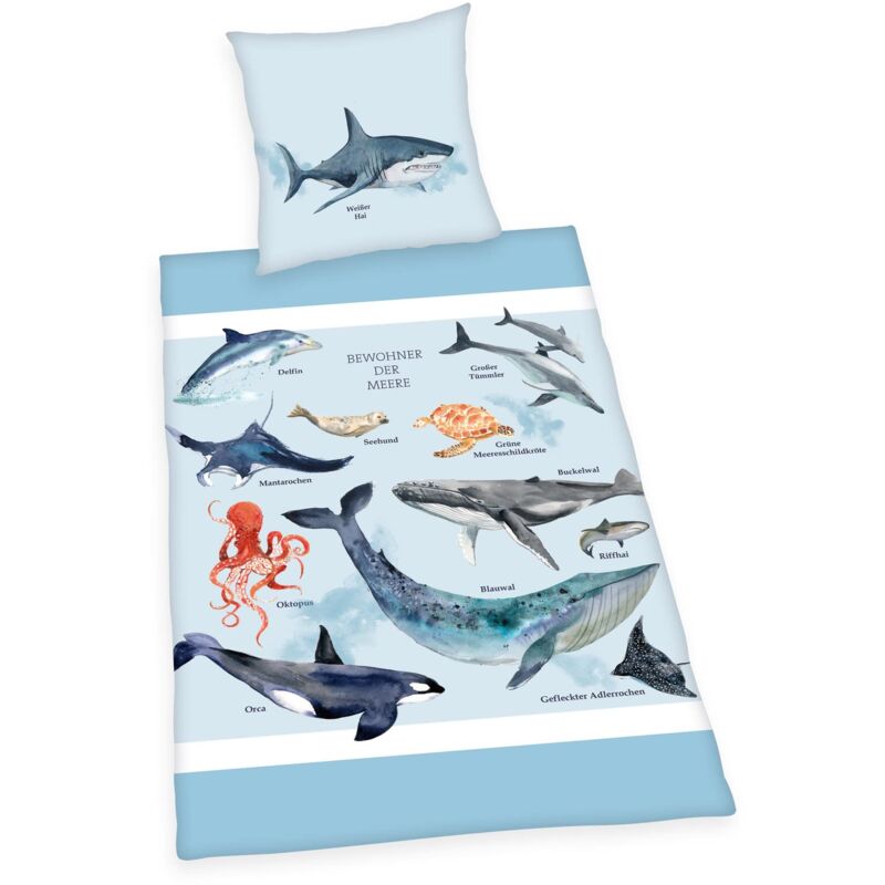 Ottima idea regalo per tutte le occasioni: biancheria da letto termoregolatrice realizzata in cotone delicato sulla pelle con divertente fantasia con creature marine - Set da 2 pezzi con design originale con licenza: fantasia modificabile grazie al copripiumino e alla federa reversibili con motivi diversi sui due lati - Cambio semplice e veloce: federa e copripiumino con pratica cerniera scorrevole - Materiale di alta qualità: 100% cotone renforcé, Prodotto in conformità con OEKO-TEX STANDARD 100, Colori brillanti, Facile da pulire: lavabile in lavatrice a 60°C, Asciugabile in asciugatrice - Contenuto: 1x Herding Set biancheria da letto, Creature del mare, 1 federa 70 x 90 cm + 1 copripiumino 140 x 200 cm, Prodotto in conformità con OEKO-TEX STANDARD 100, Materiale: 100% Cotone renforcé, Colore: Blu, Art. N. 4459289077