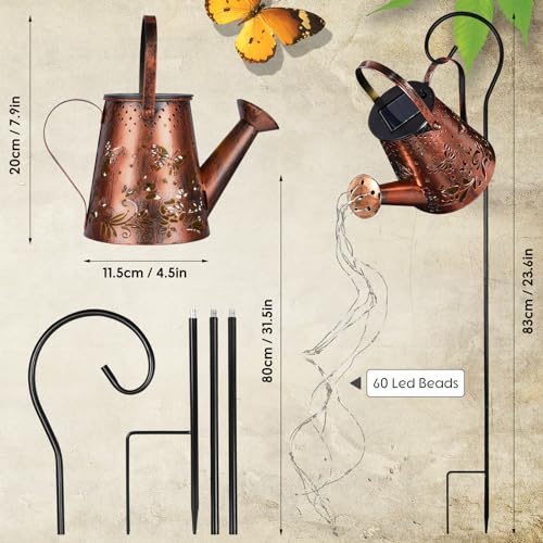 Annaffiatoio Luci Solari: l'Annaffiatoio solare viene fornito con 6 luci a stringa di rame a LED, punti bianchi caldi sono allineati sul piccolo filo di rame, sembra che stia versando acqua. L'inaspettata bellezza della luce attraverso la lastra di metallo intagliato traforato ti darà una sensazione sognante di notte.