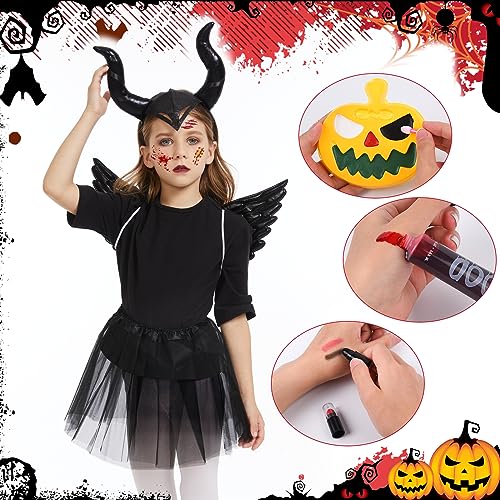 Costume da Diavolo Nero Bambini - Il nostro kit di accessori per il costume da angelo include 1 x gonna tutù nera, 1 x ali da angelo nere, 1 x corna da regina e 1 x bacchetta nera, 1 x scatola per il trucco della zucca, 1 x sostituzione dei denti, 2 x rossetto, 1 x simulazione del sangue, 1 x adesivo per tatuaggio della cicatrice.