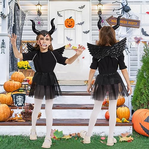 Herefun Regina Corna Costume, 8 Pezzi Travestimento Demone per Bambino, Ali Angelo Nero con Giocattoli per Il Trucco della Zucca, Costume per Halloween Carnevale Cosplay Ragazza