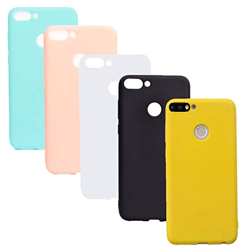 HereMore 5 x Cover per Honor 7A / Huawei Y6 2018 / Y6 Prime 2018, Custodia Morbido Opaco in Matt Silicone Gel TPU Anti-graffio Antiurto Cover Protezione Case - Nero,Bianca,Rosa,Verde,Giallo