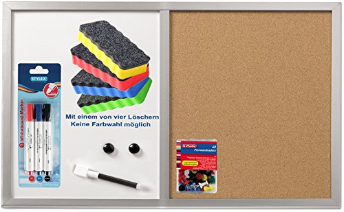Herlitz 10685394 bacheca e lavagna magnetica, 40 x 60 cm con cornice in legno, Argento/set combinato inkl. Marker, Löscher & Nadeln