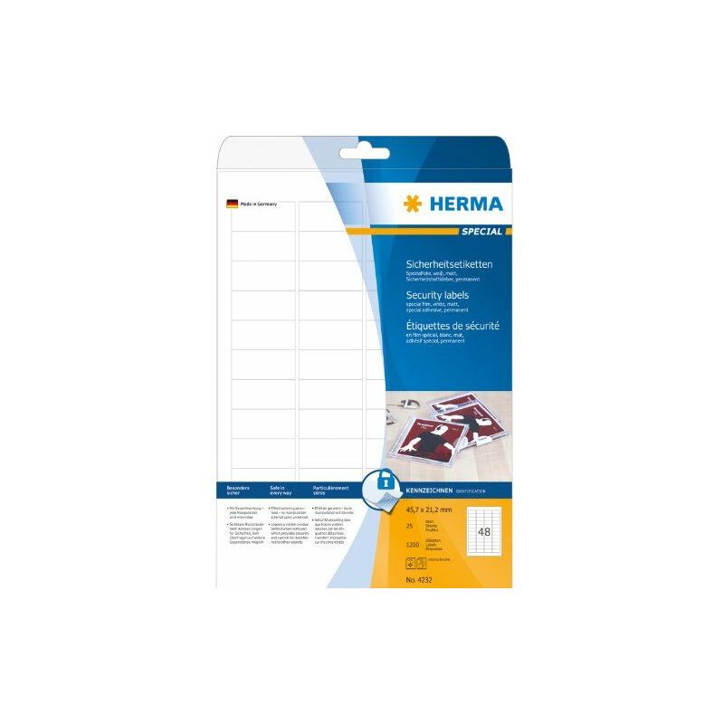 HERMA 4232. Colore del prodotto: Bianco, Tipo etichetta: Etichetta per stampante autoadesiva, Formato: A4. Larghezza dell'etichetta: 4,57 cm, Altezza dell'etichetta: 2,12 cm, Larghezza del foglio: 21 cm. Etichette da pacchi: 1200 pezzo(i), Fogli per pacco: 25 fogli, Etichette per foglio: 48 pezzo(i). Paese di origine: Germania, Caratteristiche tecniche: border on all sides