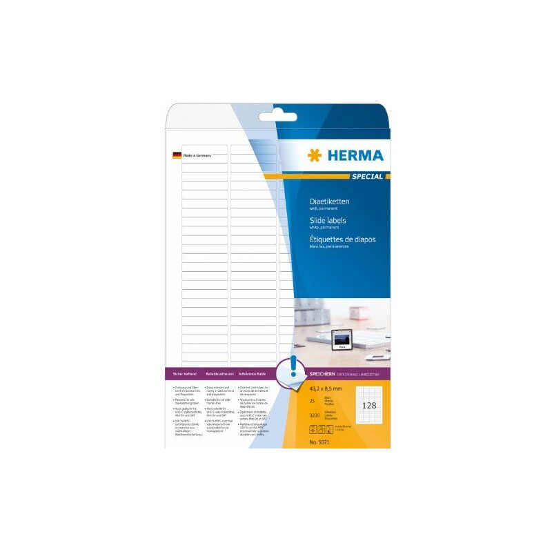 HERMA 5071. Colore del prodotto: Bianco, Forma: Rettangolo con angoli arrotondati, Tipo di adesivo: Permanente. Larghezza: 43,2 mm, Altezza: 8,5 mm. Etichette da pacchi: 3200 pezzo(i), Etichette per foglio: 128 pezzo(i), Fogli per pacco: 25 fogli