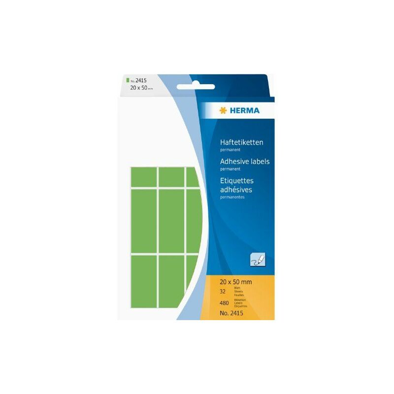 HERMA 2415. Colore del prodotto: Verde, Forma: Rettangolo con angoli arrotondati, Materiali: Cellulosa, Carta. Larghezza: 20 mm, Altezza: 50 mm, Larghezza del foglio: 11,1 cm. Etichette da pacchi: 480 pezzo(i), Fogli per pacco: 32 fogli
