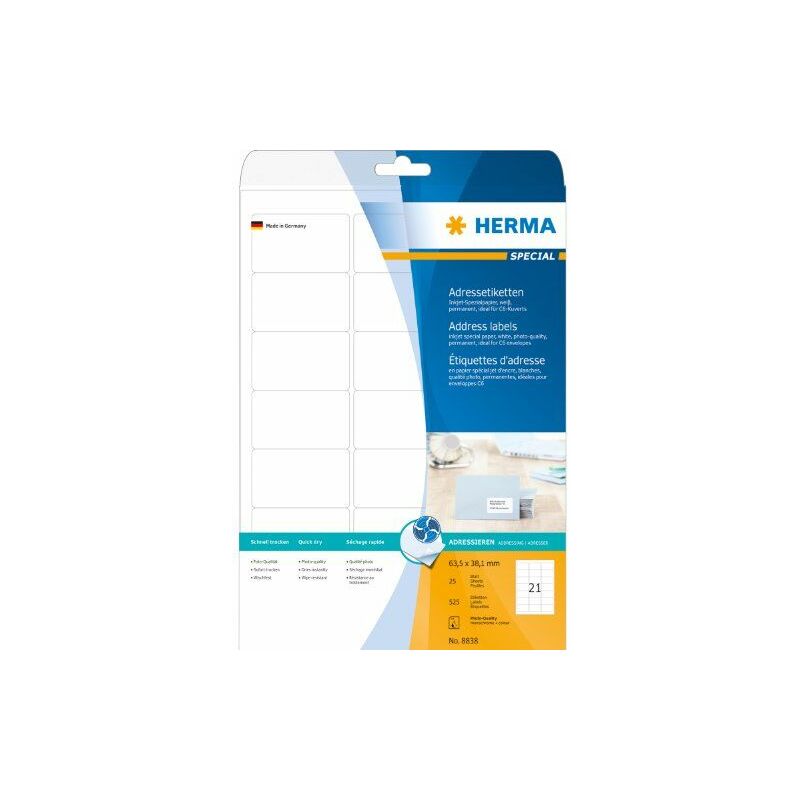 HERMA 8838. Colore del prodotto: Bianco, Materiali: Carta, Tecnologia di stampa: Ad inchiostro. Larghezza dell'etichetta: 6,35 cm, Altezza dell'etichetta: 3,81 cm, Larghezza imballo: 212 mm. Etichette da pacchi: 525 pezzo(i), Fogli per pacco: 25 fogli, Etichette per foglio: 21 pezzo(i)