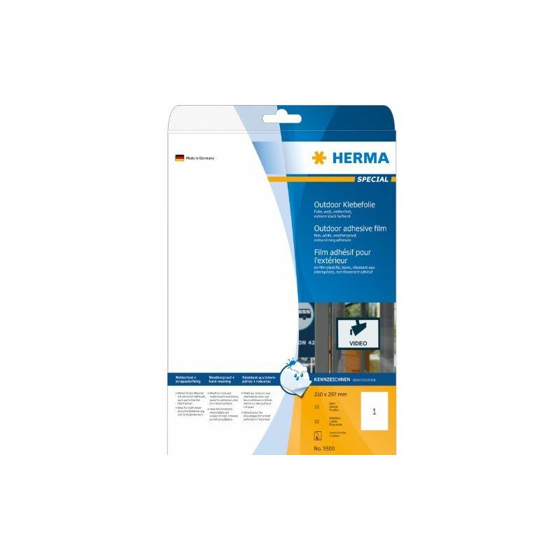 HERMA 9500. Colore del prodotto: Bianco, Tipo etichetta: Etichetta per stampante autoadesiva, Formato: A4. Larghezza dell'etichetta: 21 cm, Altezza dell'etichetta: 29,7 cm. Larghezza imballo: 212 mm, Profondità imballo: 8 mm, Altezza imballo: 325 mm. Etichette da pacchi: 10 pezzo(i), Fogli per pacco: 10 fogli, Etichette per foglio: 1 pezzo(i). Paese di origine: Germania, Caratteristiche tecniche: opaque, outdoor