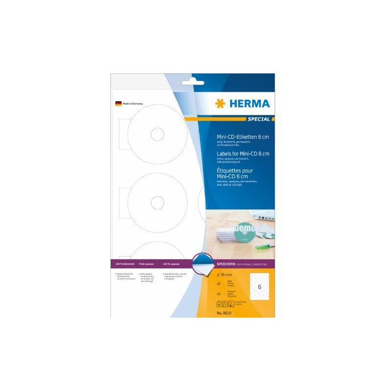 HERMA 8619. Colore del prodotto: Bianco, Tipo etichetta: Etichetta per stampante autoadesiva, Formato: A4. Larghezza dell'etichetta: 7,8 cm, Altezza dell'etichetta: 7,8 cm. Larghezza imballo: 225 mm, Profondità imballo: 3 mm, Altezza imballo: 320 mm. Etichette da pacchi: 60 pezzo(i), Fogli per pacco: 10 fogli, Etichette per foglio: 6 pezzo(i). Paese di origine: Germania