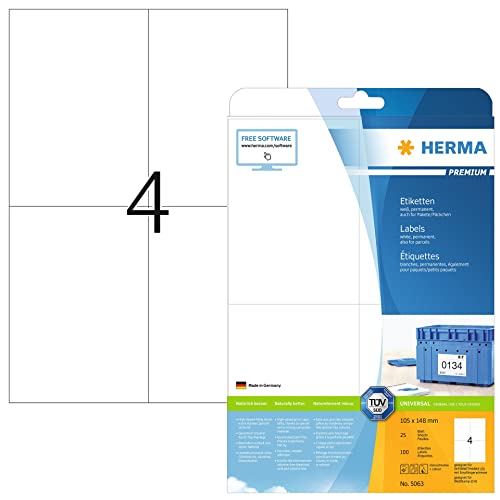 HERMA Etichette multiuso autoadesive, 4 etichette per foglio A4, 100 etichette per stampanti laser e inkjet, grandi, 105 x 148 mm (5063)
