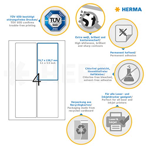 HERMA Etichette per Pacchi e Spedizioni, 78,7 x 139,7 mm, Etichette Adesive A4 per Stampante, 4 Etichette per Foglio, Bianco