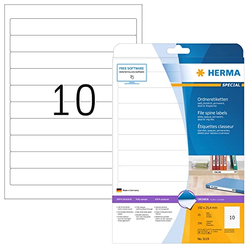 HERMA Etichette per Raccoglitori, 192 x 25,4 mm, Etichette Adesive A4 per Stampante, 10 Etichette per Foglio, Bianco