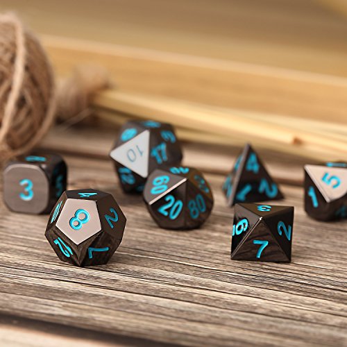 Hestya 7 Pezzi Dadi Metallici DND Poliedrico Solido Metallo D&D Dadi Nichel Nero Set con Numeri Blu e Scatola Metallica per Gioco di Ruolo Dungeons And Dragons Gioco, Insegnamento della Matematica