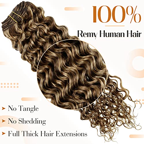 Hetto Extension Clip in Capelli Remy Double Weft Marrone Scuro Evidenziato da Biondo Caramello Onda Naturale 14 Pollici 7 Pezzi 100G per Confezione