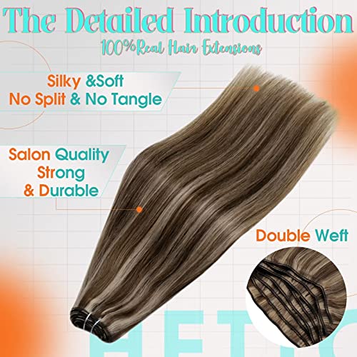 Hetto Remy Weft Hair Extensions Light Brown with Blonde Extensions Human Hair Extensions Weft 12Inch Short Hair Weft Extensions Brown Human Hair #4/27 70 Grams
