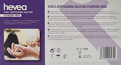 Hevea, guanti in vinile monouso. Senza talco e senza lattice. Set da 5 scatole da 100 guanti. Taglia: L (Large)