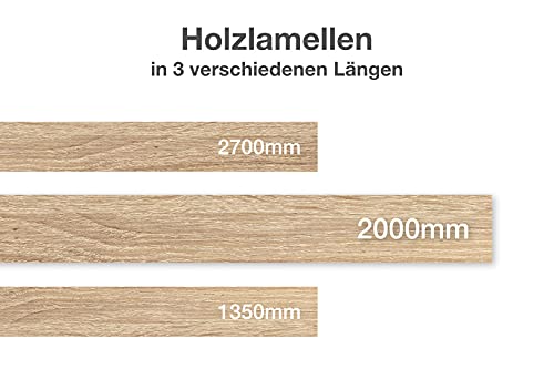 Installazione facile e veloce grazie all'esclusivo sistema a scatto - i profili di montaggio in PVC sono fissati alla distanza desiderata. Le doghe di legno vengono poi agganciate al loro posto. Le estremità aperte delle lamelle possono essere coperte con adesivi di copertura disponibili separatamente. Le istruzioni di installazione consigliate si trovano nelle immagini del prodotto e nella fornitura.
