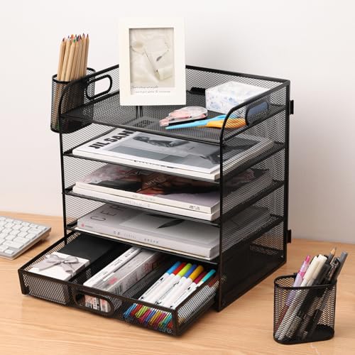 Hggzeg Organizer in rete per lettere, organizer da scrivania per ufficio, portadocumenti, formato A4, per casa, ufficio, scuola (rete metallica, 5 ripiani, cassetto e portapenne)