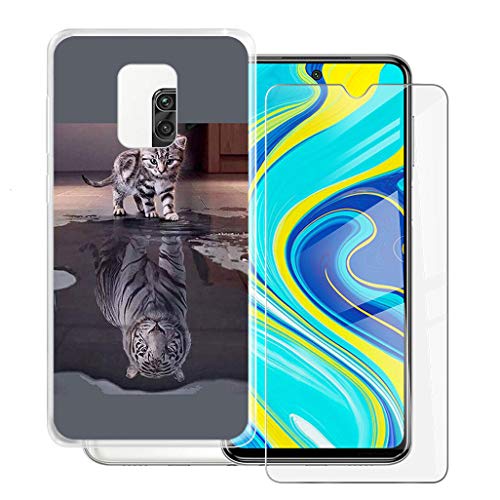 HHUAN Custodia + Vetro Temperato per Xiaomi Redmi Note 9S (6.67") 9H Durezza HD Pellicola Protettiva, Trasparente Cover Ultra Morbida Silicone TPU Bumper Case - Tigre e Gatto