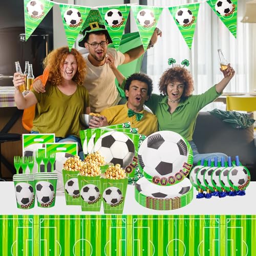 Hiaktnlh Attrezzatura per feste di calcio per il compleanno dei bambini, piatti di calcio per il compleanno dei bambini, piatti di cartone, tazze, tovaglioli e cannucce per 10 ospiti (04-ZUQIU-D1)