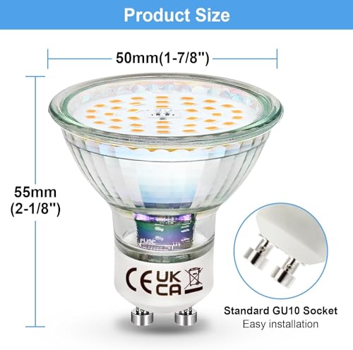 【Cosa ottieni】Una confezione di 10 lampadine GU10 LED a 3000K e una garanzia di due anni senza domande. Questi faretti LED non sono dimmerabili. Si prega di non utilizzarli con un dimmer.