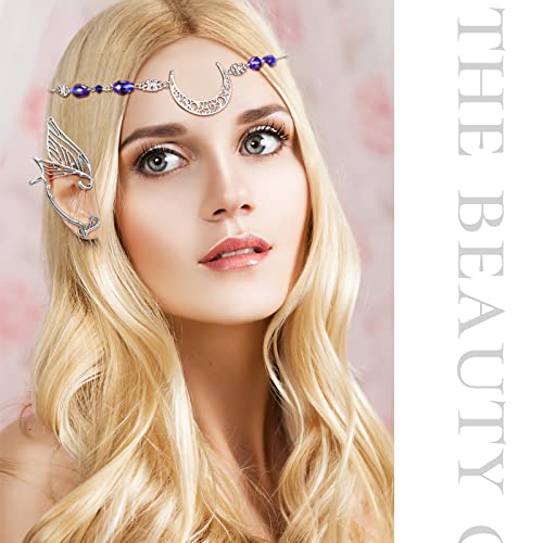 HIFOT Accessori per Capelli Boho Donna, Catenina per Capelli Luna Tiara Elfica, Orecchie Elfo Orecchini Argento, Accessori Nozze Copricapo Halloween Costume Cosplay Matrimonio