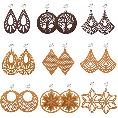HIFOT 9 Paia Boemia Set Orecchini Clip Donna legno, Ragazza Orecchini Senza Buco, No Piercing Orecchino Legno Anallergici